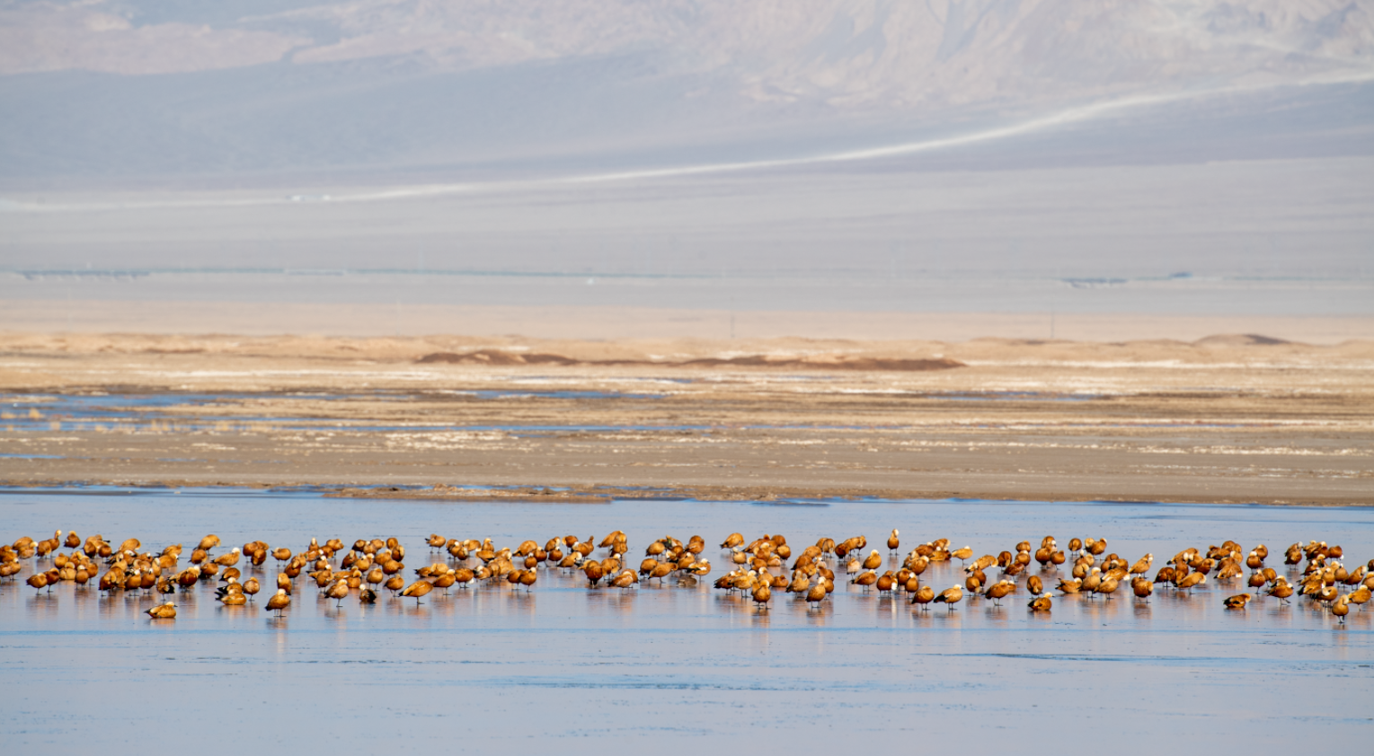 數(shù)千只赤麻鴨在茫崖尕斯庫勒湖濕地休憩