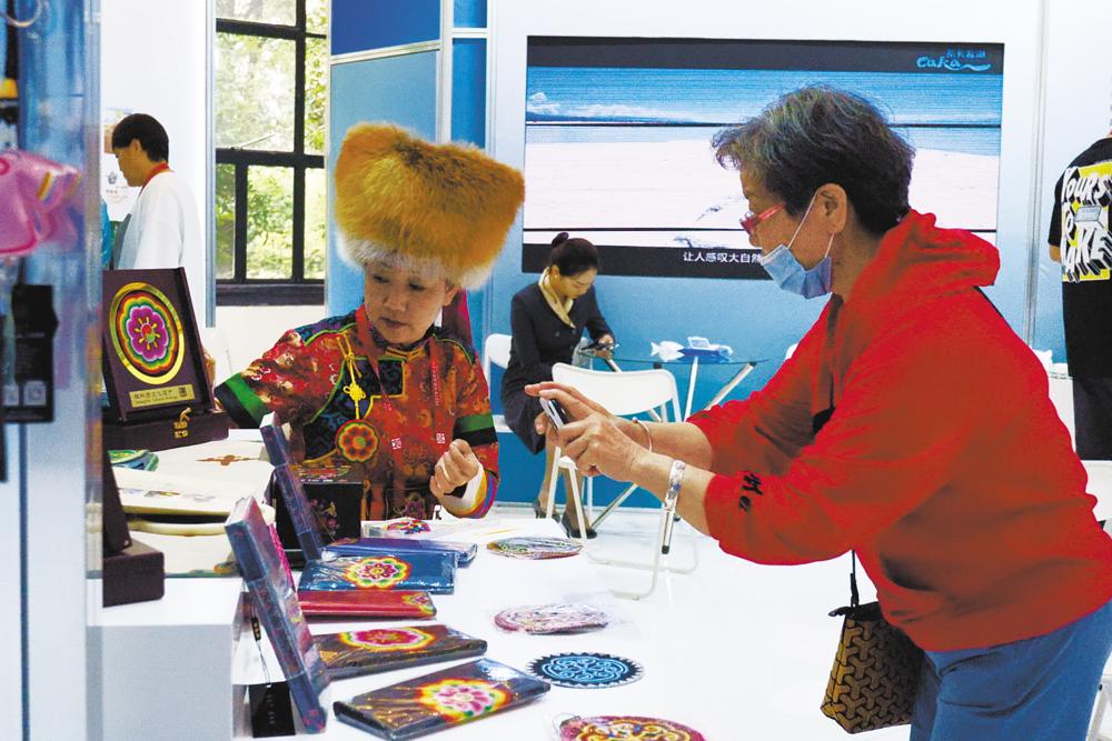 這個(gè)夏天去青海! 土族盤繡吸引了不少人駐足。 青海日?qǐng)?bào)記者 鐘倩 攝 青海湖旅游控股有限公司研發(fā)的文創(chuàng)產(chǎn)品吉祥物“藍(lán)嘟嘟”玩偶、旅游地圖、鑰匙扣、紀(jì)念幣等豐富的小物件備受參觀群眾的青睞!