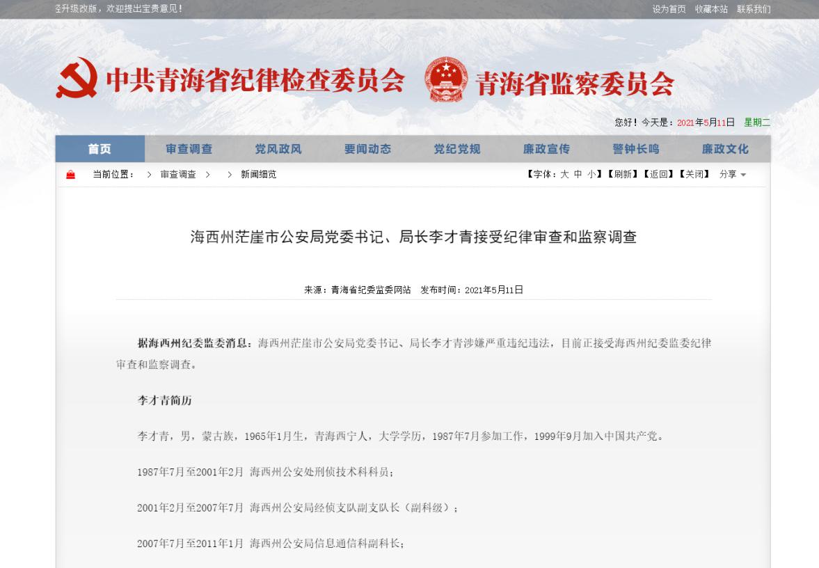 青海省海西州茫崖市公安局黨委書(shū)記、局長(zhǎng)李才青接受紀(jì)律審查和監(jiān)察調(diào)查 圖片來(lái)源:青海省紀(jì)委監(jiān)委網(wǎng)站 據(jù)青海省紀(jì)委監(jiān)委網(wǎng)站消息:海西州茫崖市公安局黨委書(shū)記、局長(zhǎng)李才青涉嫌嚴(yán)重違紀(jì)違法,目前正接受海西州紀(jì)委監(jiān)委紀(jì)律審查和監(jiān)察調(diào)查。 李才青簡(jiǎn)歷 李才青,男,蒙古族,1965年1月生,青海西寧人,大學(xué)學(xué)歷,1987年7月參加工作,1999年9月加入中國(guó)共產(chǎn)黨!