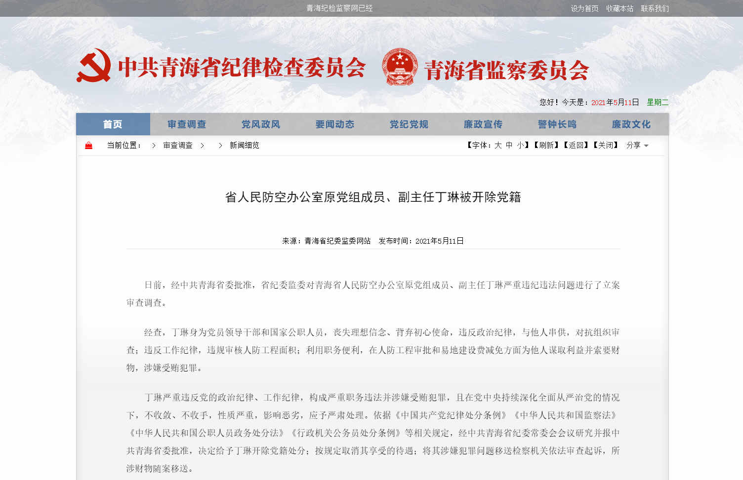 青海省人民防空辦公室原黨組成員、副主任丁琳被開(kāi)除黨籍 圖片來(lái)源:青海省紀(jì)委監(jiān)委網(wǎng)站 據(jù)青海省紀(jì)委監(jiān)委網(wǎng)站消息:日前,經(jīng)中共青海省委批準(zhǔn),青海省紀(jì)委監(jiān)委對(duì)青海省人民防空辦公室原黨組成員、副主任丁琳嚴(yán)重違紀(jì)違法問(wèn)題進(jìn)行了立案審查調(diào)查。 經(jīng)查,丁琳身為黨員領(lǐng)導(dǎo)干部和國(guó)家公職人員,喪失理想信念、背棄初心使命,違反政治紀(jì)律,與他人串供,對(duì)抗組織審查;違反工作紀(jì)律,違規(guī)審核人防工程面積;利用職務(wù)便利,在人防工程審批和易地建設(shè)費(fèi)減免方面為他人謀取利益并索要財(cái)物,涉嫌受賄犯罪!