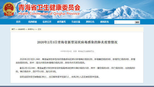 人民網(wǎng)西寧2月4日電(蔣瑩)2月4日,本網(wǎng)從青海省衛(wèi)生健康委獲悉,截至2月3日24時,青海省報告新型冠狀病毒感染的肺炎新增確診病例2例,新增重癥病例0例,新增死亡病例0例,新增出院病例0例。其中:海北州報告新增確診病例2例,其他市州無報告病例。
