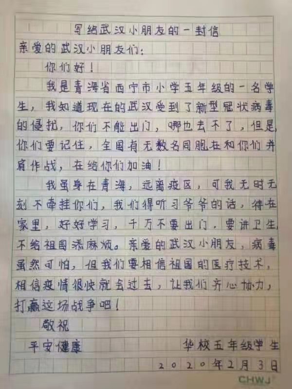 “親愛的武漢小朋友……讓我們齊心協(xié)力,打贏這場戰(zhàn)爭吧!”這是西寧市城中區(qū)華羅庚實驗學(xué)校五年級的孩子利用停課期間所寫的信件內(nèi)容。連日來,城中區(qū)教育系統(tǒng)停課不停學(xué)、停學(xué)不停教,全區(qū)各校(園)踴躍響應(yīng),鼓勵孩子們用寫信、繪畫、拍視頻等多種方式表達(dá)愛國之心、充實假期生活。