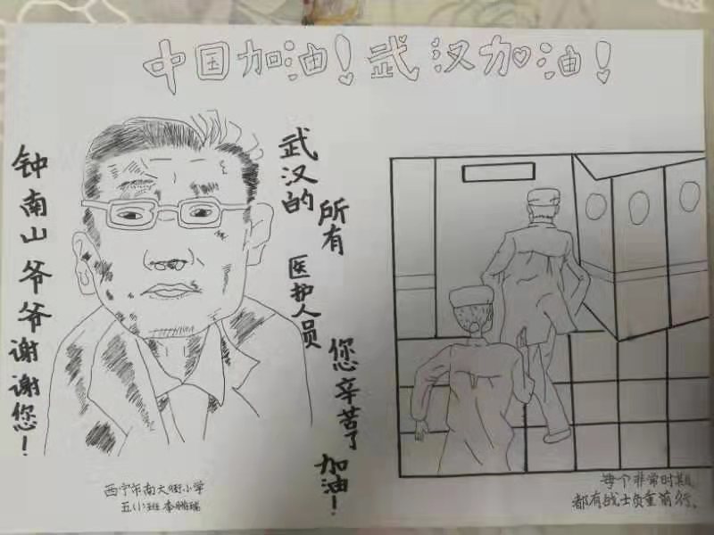 除了給武漢小朋友和白衣天使寫信,孩子們還創(chuàng)作了“控制疫情從我做起”、“加油武漢、加油中國”手抄報,“致敬先鋒我參與”自編短視頻等,目前已創(chuàng)作了手抄報66份,小視頻63段、信件12封。這些作品充滿童心、各有特色,但都以為武漢加油、為中國加油為主題,繪出了一個愛國同心圓。