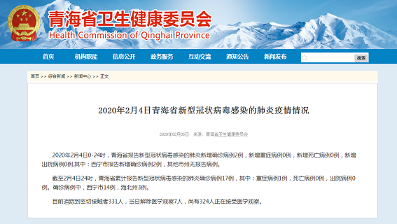 截至2月4日24時(shí),青海省累計(jì)報(bào)告新型冠狀病毒感染的肺炎確診病例17例,其中:重癥病例1例,死亡病例0例,出院病例0例。確診病例中,西寧市14例,海北州3例。