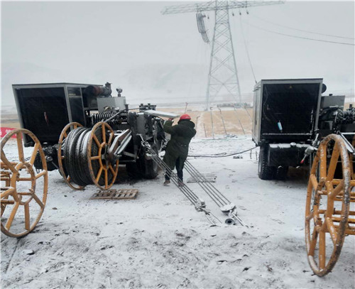 張力機(jī)操作人員頂風(fēng)冒雪展開導(dǎo)線展放工作 魏澎拍攝