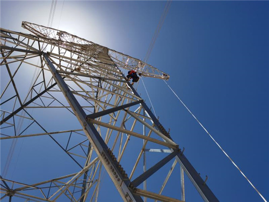 背上工器具,三人爬上60米高的鐵塔,兩人做好個人安全保護(hù)措施,分別用驗(yàn)電器驗(yàn)電確認(rèn)兩條線路均已停電,用兩根長10余米的接地線將輸電導(dǎo)線和鐵塔橫擔(dān)牢牢相連。如此高的海拔下,人員活動本就吃力,再加上空中大風(fēng)的影響,他們用了近兩個小時才完成工作任務(wù)安全下塔。