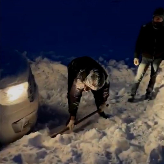 中午十一點(diǎn)半,兩輛公司的救援車趕到,送來了食物和水。但經(jīng)過多次嘗試依然沒能把陷進(jìn)雪坑的車輛拖出來。
