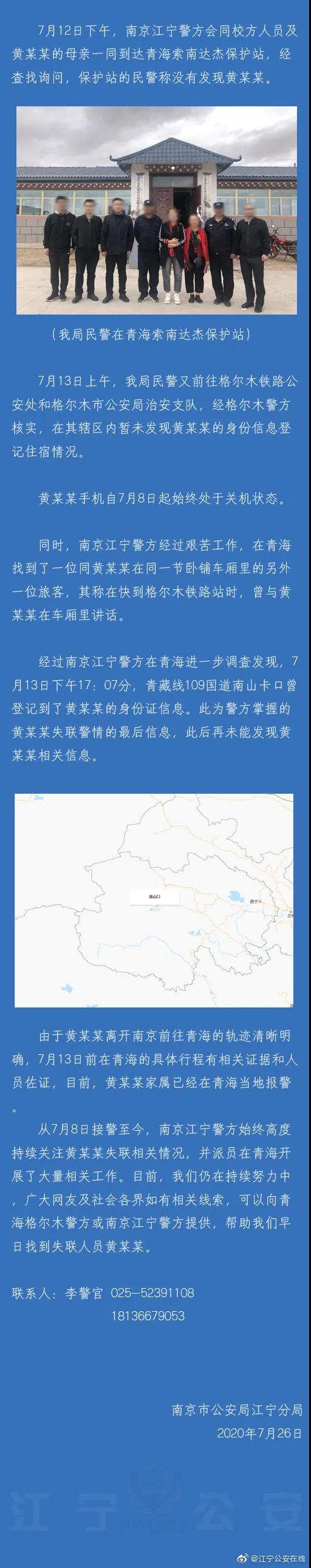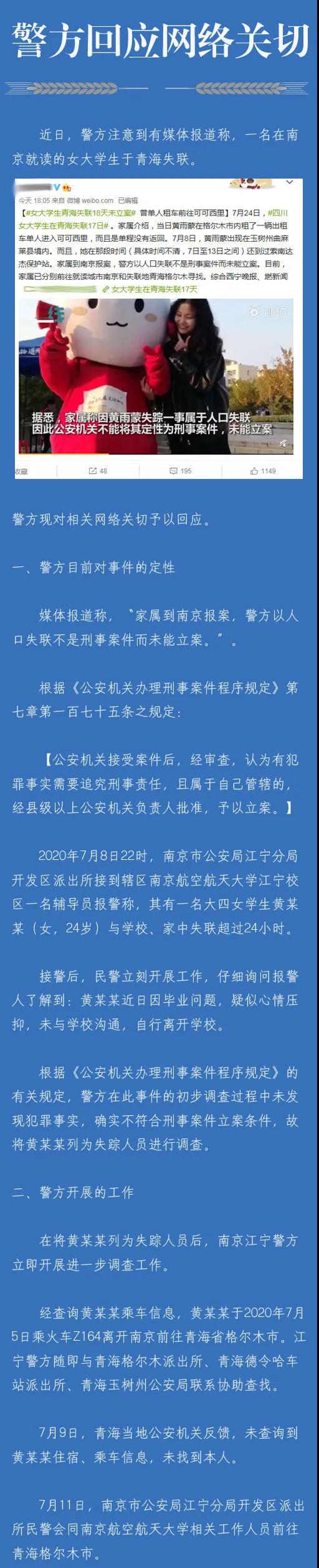 江蘇警方回應(yīng)關(guān)于“南京一名女大學(xué)生在青海失聯(lián)”相關(guān)調(diào)查情況