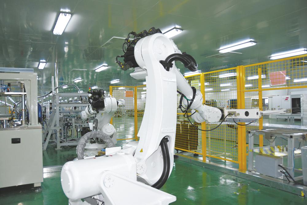 生產(chǎn)線上機(jī)械手臂組裝高倍聚能光伏電板。