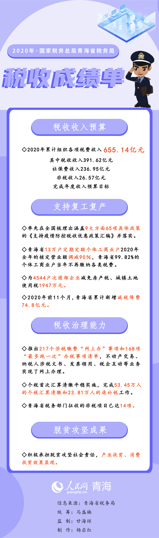 人民網(wǎng)西寧1月21日電 (楊啟紅)1月20日,本網(wǎng)從青海省稅務(wù)工作會(huì)議上了解到,2020年,青海省累計(jì)組織各項(xiàng)稅費(fèi)收入655.14億元,其中稅收收入391.62億元,社保費(fèi)收入236.95億元,非稅收入26.57億元,圓滿完成年度收入預(yù)算目標(biāo)。