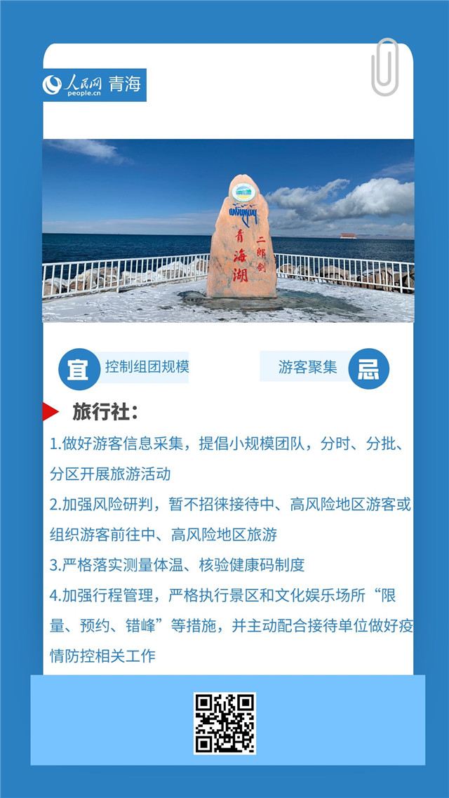 人民網(wǎng)西寧1月21日電 (陳明菊)春節(jié)臨近,為做好文化旅游市場常態(tài)疫情防控工作,給廣大市民群眾創(chuàng)造一個安全舒適的文化旅游環(huán)境,西寧市文化市場綜合行政執(zhí)法監(jiān)督局結(jié)合當(dāng)前疫情防控工作形勢,發(fā)布了2021年春節(jié)期間文化旅游市場疫情防控和安全生產(chǎn)工作溫馨提示。