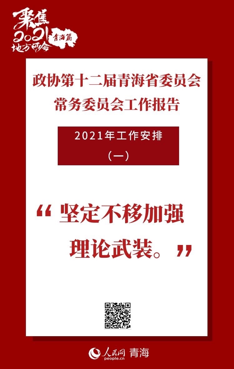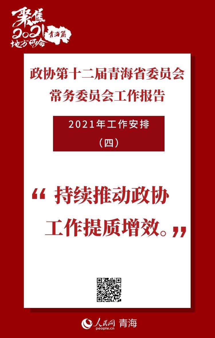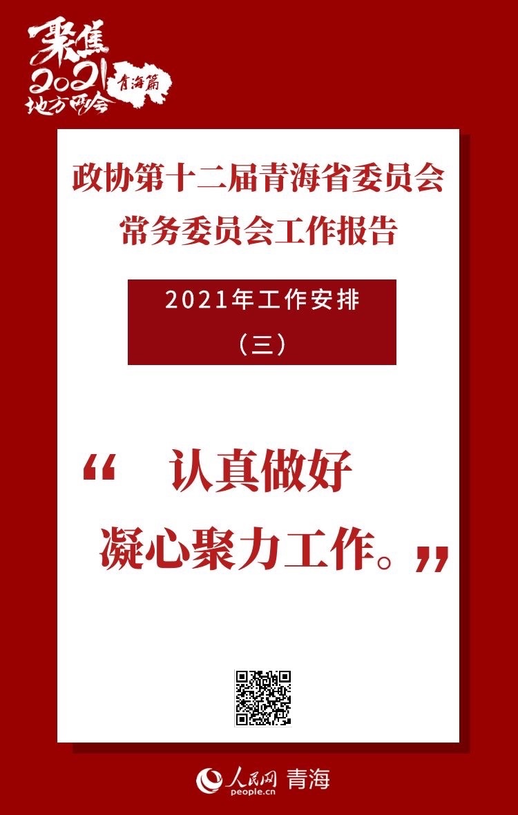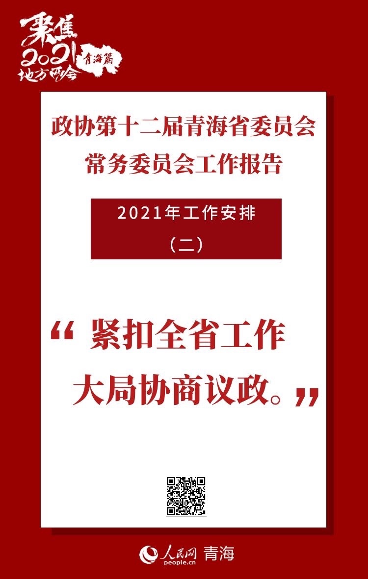 編者按:2021年1月29日,青海省政協(xié)十二屆四次會議順利開幕。青海省政協(xié)主席多杰熱旦代表政協(xié)第十二屆青海省委員會常務委員會向大會報告工作。2021年,青海省政協(xié)及其常委會的工作將緊緊圍繞“十四五”高質(zhì)量發(fā)展深入?yún)f(xié)商議政,廣泛凝心聚力,為全面開啟青海社會主義現(xiàn)代化建設新征程,在新的起點上奮力推進“一優(yōu)兩高”發(fā)展戰(zhàn)略,建設富裕文明和諧美麗新青海努力奮斗。