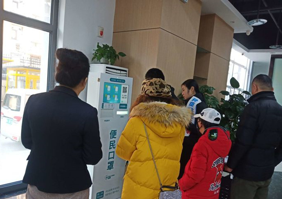 剛安裝好機器的服務(wù)大廳里熱鬧非凡,社區(qū)居民正在智能便民口罩機前排隊領(lǐng)取口罩。只需拿出手機掃描口罩機屏幕上的二維碼,幾秒鐘后,口罩機就會“吐”出獨立包裝的一次性醫(yī)用口罩。