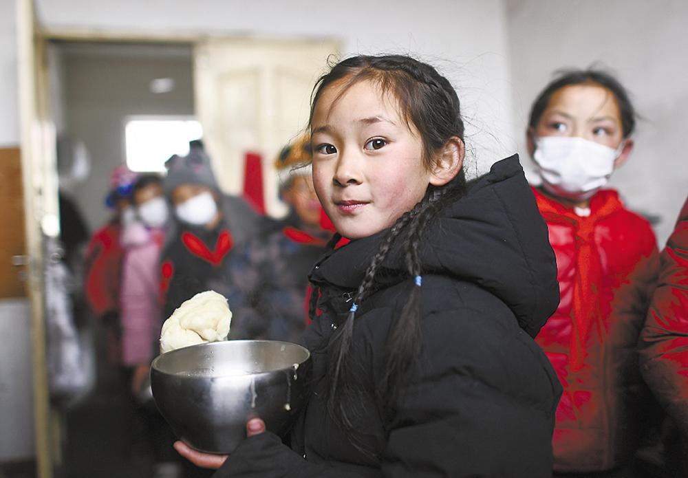3月16日,在索加鄉(xiāng)寄宿小學(xué)食堂,白瑪措毛(前)和同學(xué)們一起打飯。