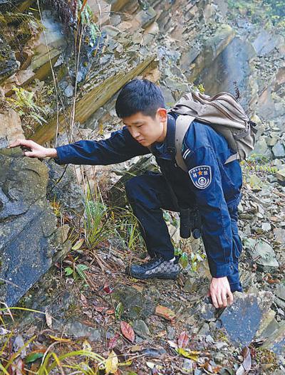 陳亮亮在攀爬巡護線路中的一處陡坡。新華社記者 萬 象攝