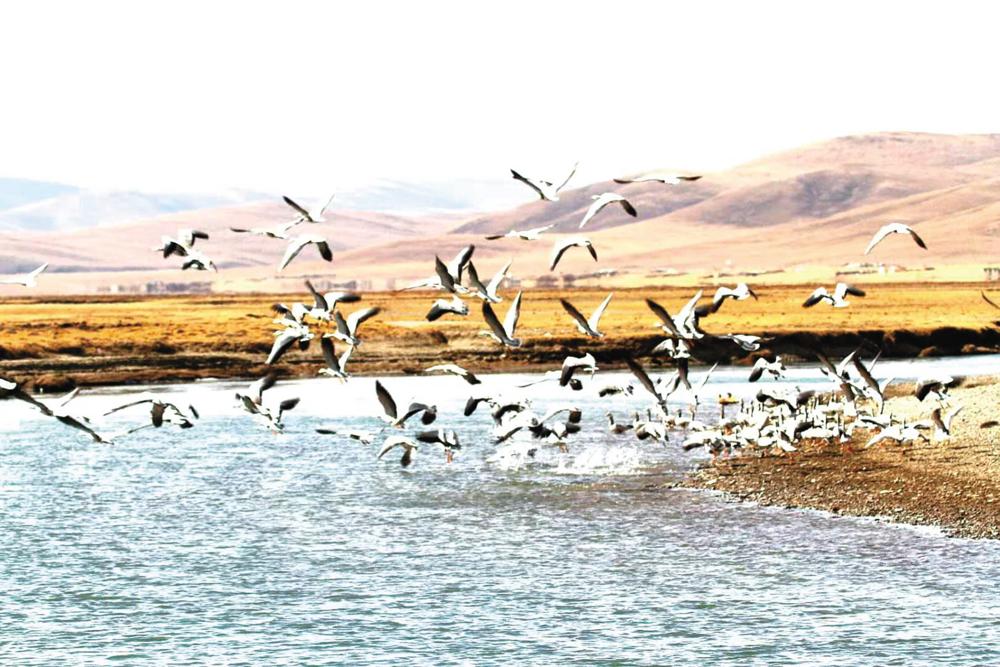 嘉塘草原扎曲河灣上起飛的斑頭雁群。本報(bào)記者 姚斌 攝