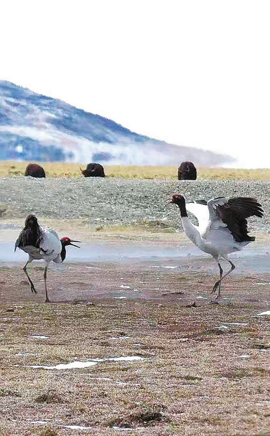 落戶后的黑頸鶴“夫婦”,在用優(yōu)美的舞姿示愛(ài)。
