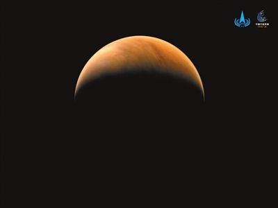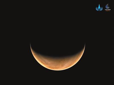 “天問一號”探測器飛行至距離火星1.1萬千米處,利用中分辨率相機(jī)拍攝了火星全景。此時(shí),由于探測器處于火星側(cè)后方上空(以面向太陽為前方),得到兩幅“側(cè)身”影像。
