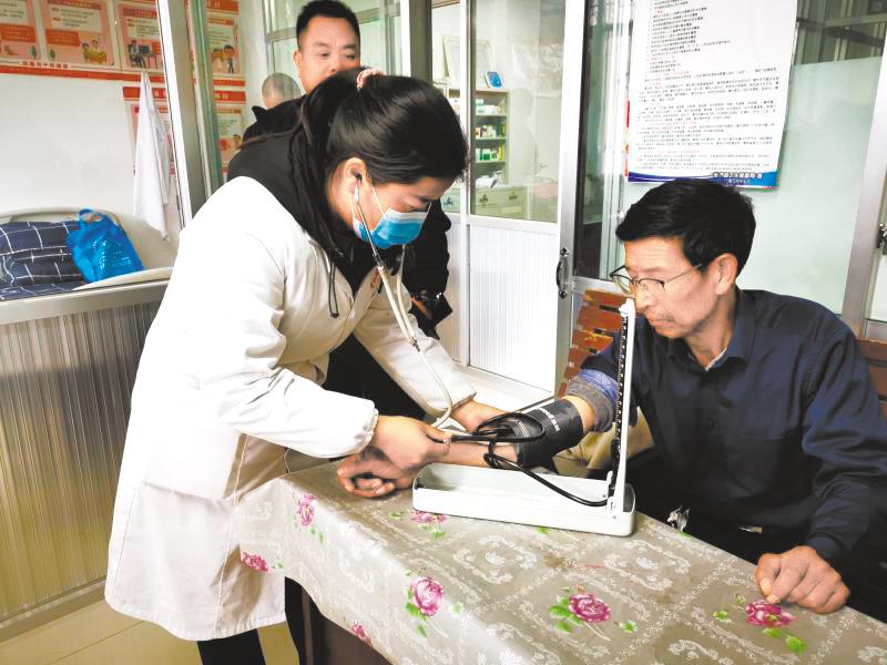 郭拉村衛(wèi)生室村醫(yī)給村民量血壓。 青海日報記者 李雪萌攝