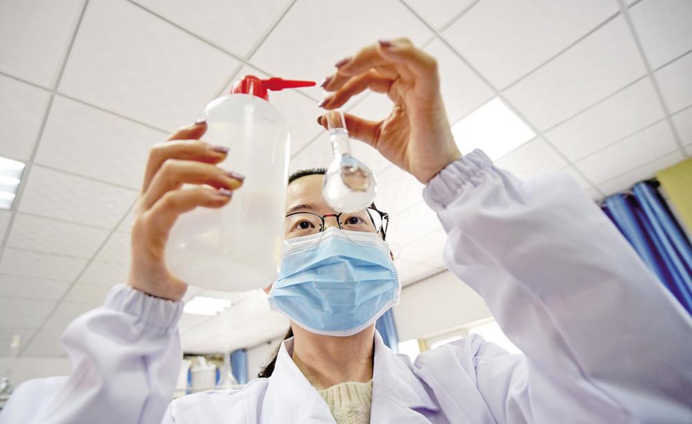 工作人員正在進(jìn)行土壤ph測定中的定容步驟。
