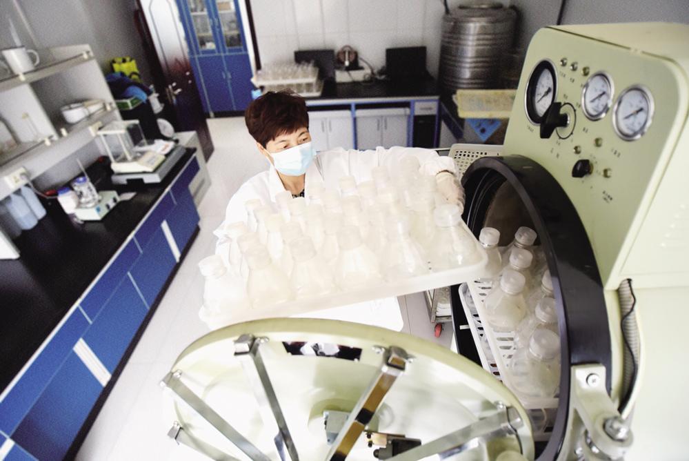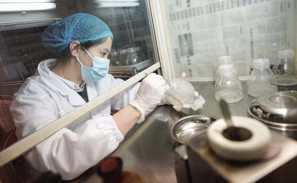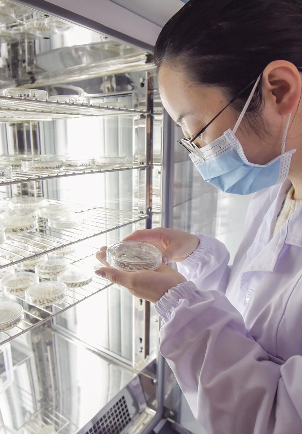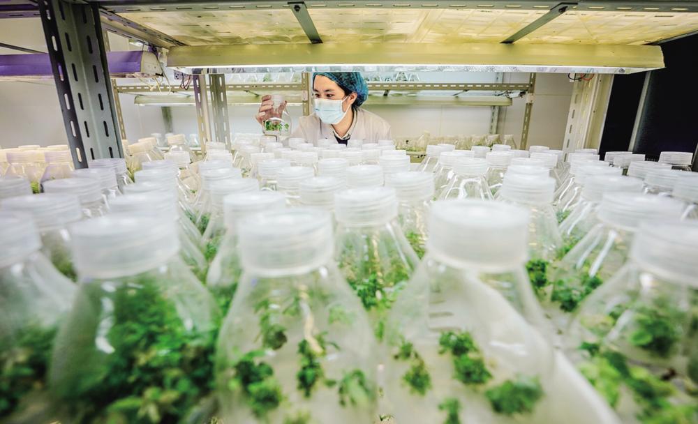 工作人員正在組培實(shí)驗(yàn)室觀測組培苗生根情況。