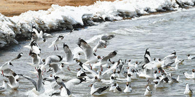 6日,青海湖開湖后,迎來(lái)棕頭鷗戲水的美景。