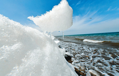 6日,青海湖岸邊堆積的各種形態(tài)的冰壩。