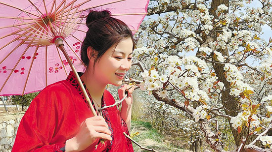 千畝古梨園,萬樹梨花香,虬龍盤錯的枝丫上梨花潔白似雪,“多情”的鮮花引來蜂群陣陣“細(xì)語”,獨(dú)有的田園風(fēng)情躍然而出。一襲漢服、手撐花紙傘的一群少女于裊裊琴韻中,從百年樹齡的古梨樹群間款款穿過,唯美且富詩意。