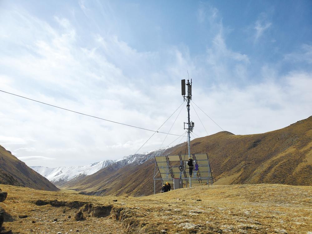 4月17日,工作人員爬上山頂對基站進(jìn)行日常維護(hù)。青海日報(bào)記者 陸廣濤 程宦寧攝