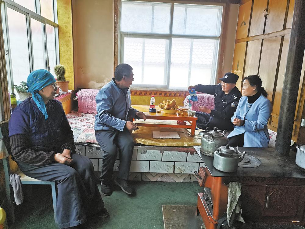 趙延壽夫婦(右)深入寺溝村村民安貴強家中進行反詐騙的宣傳。 青海日報記者 尹耀增攝