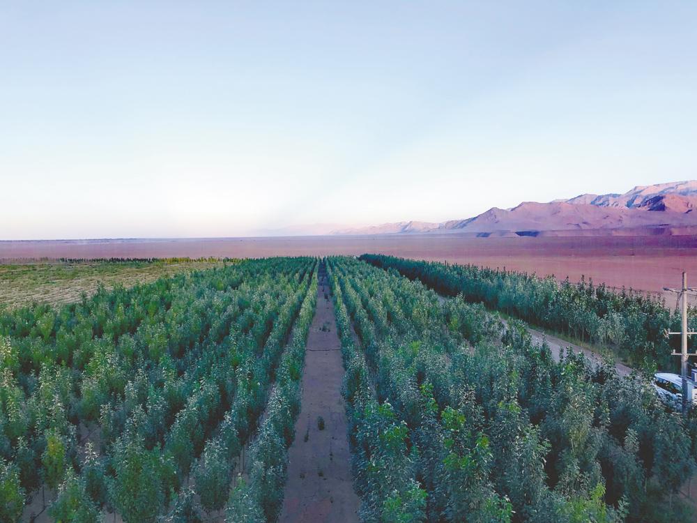 跟隨柴達木防沙治沙公司員工深一腳、淺一腳地走在治沙基地田埂上,一排排在田間地頭栽植的林木,為農(nóng)田和枸杞林構(gòu)成了一道道擋風墻。雖然眼下林木尚在發(fā)芽,到了夏秋時節(jié)就是滿目蔥郁。