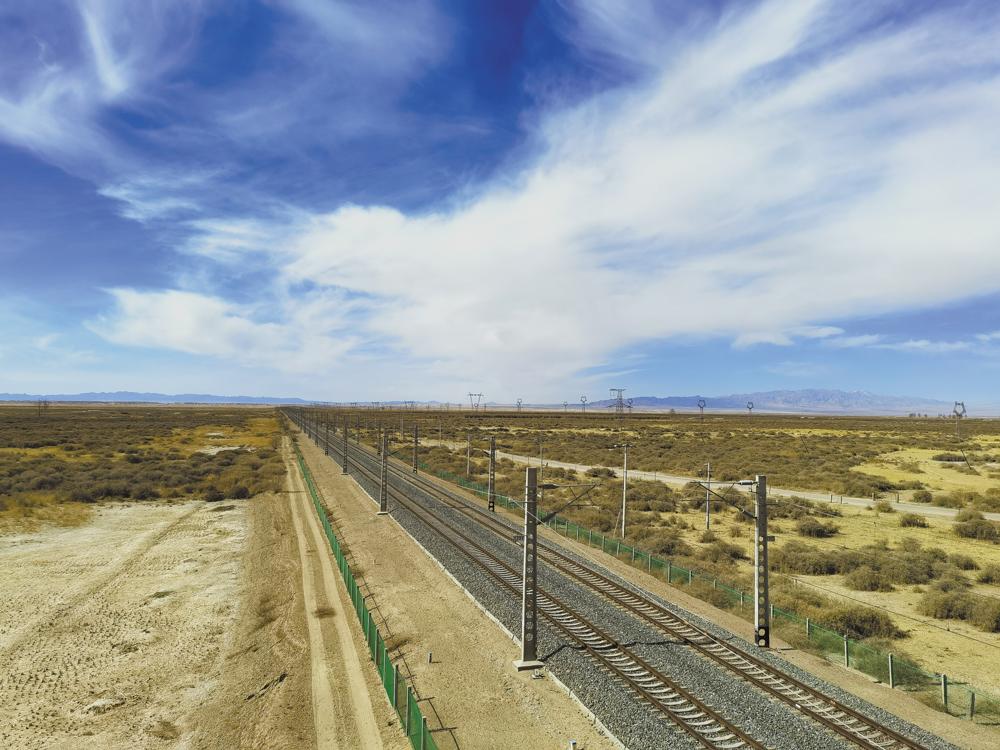 鐵路兩旁的綠化帶一直向戈壁內(nèi)延伸。青海日報記者 劉法營攝