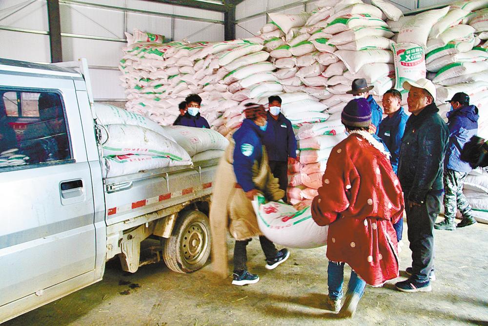 記者在位于瑪多縣瑪查理鎮(zhèn)野牛溝村的飼草料儲(chǔ)備庫見到,一袋袋飼草料被牧民裝上一輛輛車,經(jīng)214國道運(yùn)往各鄉(xiāng)鎮(zhèn)村社。