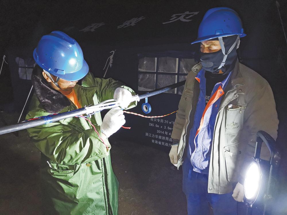 11個(gè)受災(zāi)群眾安置點(diǎn),120余名果洛電力職工,頂著雨雪,迎著寒風(fēng),與安置點(diǎn)的帳篷搭建同頻共振,建好一個(gè)、通電一個(gè)。