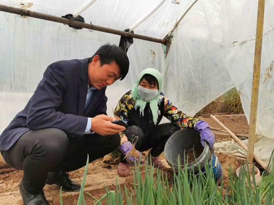 工作人員在李雙家大棚了解情況。郵儲銀行青海省分行供圖