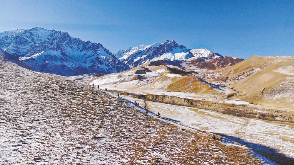 祁連山國家公園扎麻什管護(hù)站生態(tài)管護(hù)員在巡護(hù)途中(無人機(jī)照片)。新華社記者 張宏祥 攝