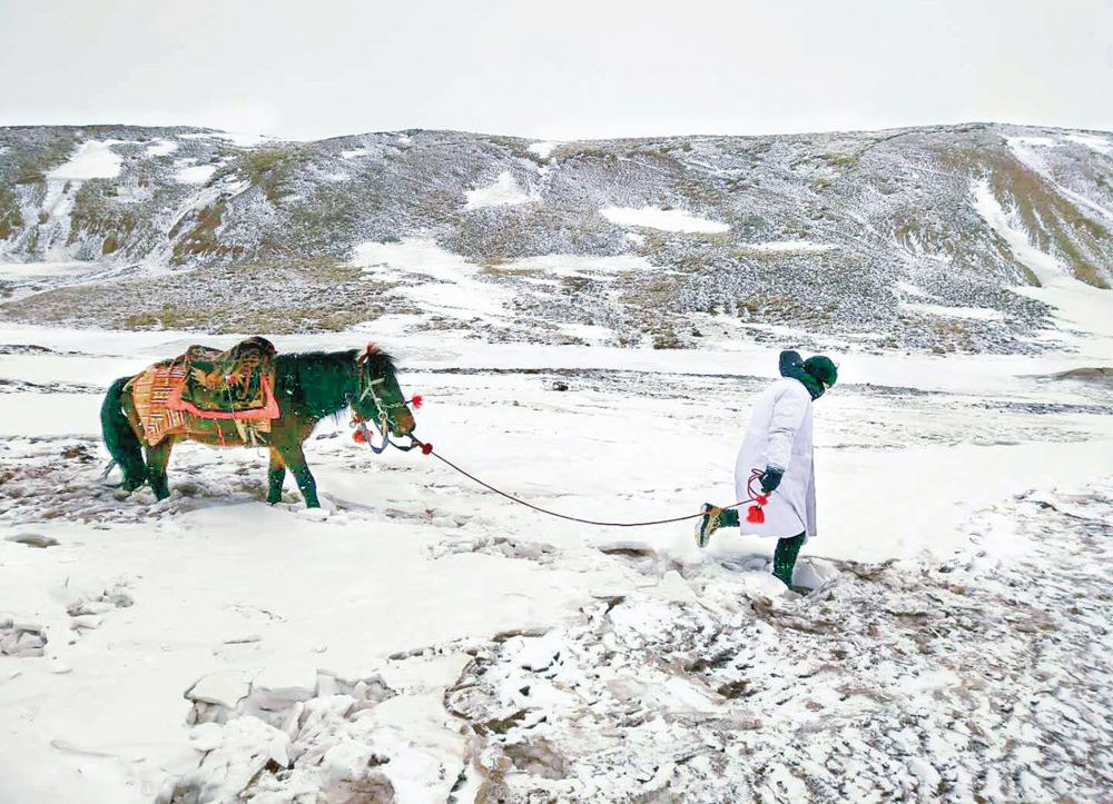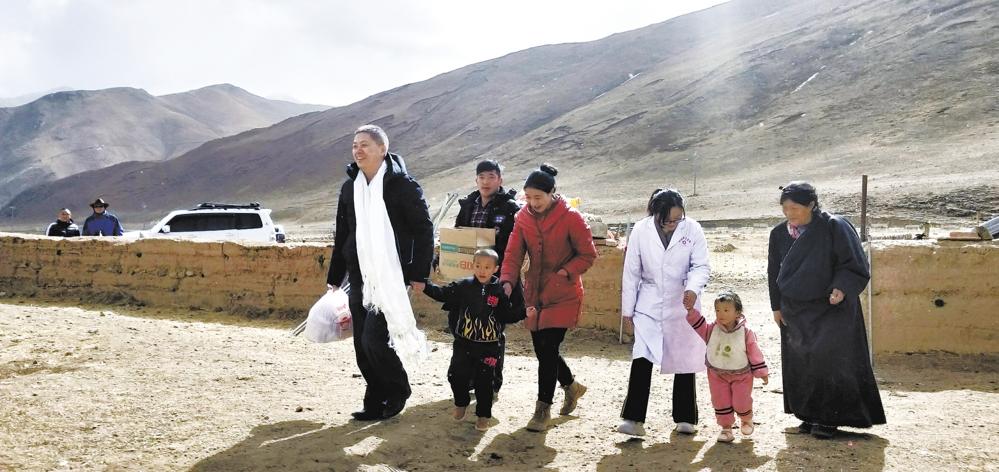 北京援青醫(yī)療團(tuán)隊(duì)領(lǐng)隊(duì)、玉樹州人民醫(yī)院院長郭勇(前一)到牧民家中走訪慰問。