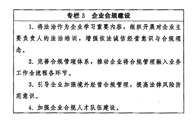 深化依法治企。深化“法律進企業(yè)”,落實經(jīng)營管理人員學(xué)法用法制度。加強企業(yè)法治文化建設(shè),提高經(jīng)營管理人員依法經(jīng)營、依法管理能力。推動企業(yè)合規(guī)建設(shè),防范法律風(fēng)險,提升企業(yè)管理法治化水平。
