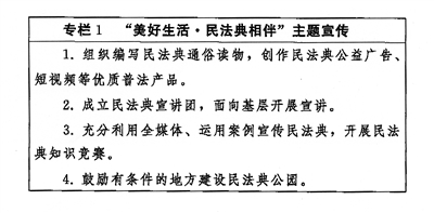廣泛開展民法典普法工作,闡釋好民法典中國特色社會主義的特質(zhì),闡釋好民法典關(guān)于民事活動平等、自愿、公平、誠信等基本原則,闡釋好民法典關(guān)于堅持主體平等、保護財產(chǎn)權(quán)利、便利交易流轉(zhuǎn)、維護人格尊嚴、促進家庭和諧、追究侵權(quán)責(zé)任等基本要求,闡釋好民法典一系列新規(guī)定新概念新精神。推動各級黨和國家機關(guān)帶頭學(xué)習(xí)宣傳民法典,推動領(lǐng)導(dǎo)干部做學(xué)習(xí)、遵守、維護民法典的表率,提高運用民法典維護人民權(quán)益、化解矛盾糾紛、促進社會和諧穩(wěn)定的能力和水平。把民法典納入國民教育體系,加強對青少年民法典教育。以“美好生活·民法典相伴”為主題,組織開展民法典主題宣傳,讓民法典走到群眾身邊、走進群眾心里。