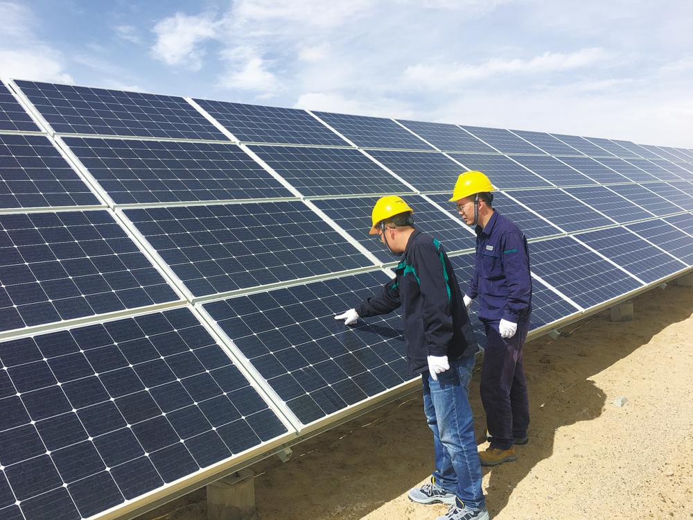 工作人員在檢查太陽能光伏板。青海日報記者 王菲菲攝