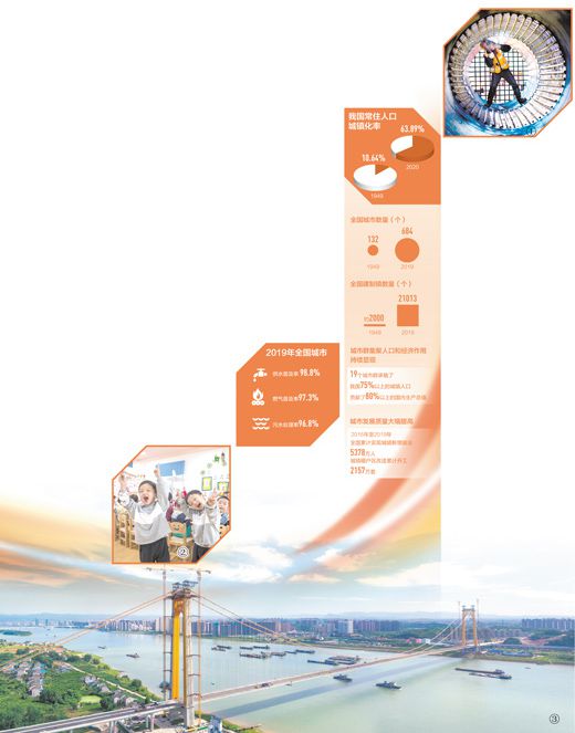 在中國共產(chǎn)黨的堅(jiān)強(qiáng)領(lǐng)導(dǎo)下,我國經(jīng)歷了世界歷史上規(guī)模最大、速度最快的城鎮(zhèn)化進(jìn)程——我國常住人口城鎮(zhèn)化率由1949年末的10.64%提高到2020年的63.89%;全國城市和建制鎮(zhèn)數(shù)量從1949年末的132個(gè)、約2000個(gè)增長到2019年的684個(gè)、逾2.1萬個(gè)。
