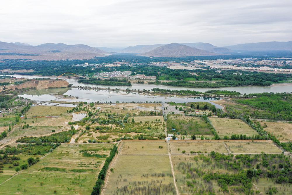 黃河水和沃野千里的良田展示著貴德縣人民“治黃造田”的成果。(無人機(jī)照片) 青海日?qǐng)?bào)記者 欒雨嘉 程宦寧 攝