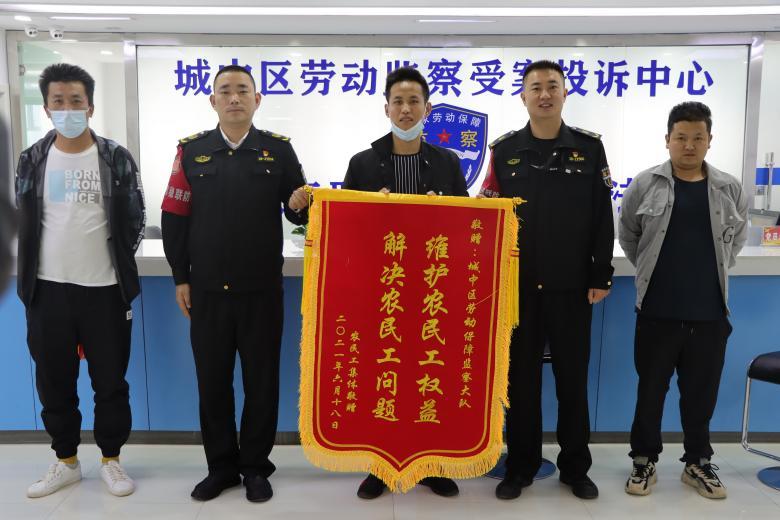 “咱們勞動監(jiān)察員實在太厲害了,沒想到這么快!”拿到血汗錢的農(nóng)民工兄弟,臉上露出了幸福的笑容,紛紛對勞動監(jiān)察員“點贊”。6月18日,3名農(nóng)民工將一面“維護農(nóng)民工權(quán)益,解決農(nóng)民工問題”的錦旗送到了城中區(qū)勞動保障監(jiān)察大隊。