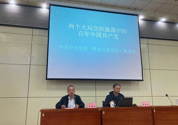 講座中,楊英杰教授結(jié)合自身深厚的理論知識(shí)和多年的研究成果,圍繞中國(guó)共產(chǎn)黨的百年歷程,深刻解讀了百年黨史蘊(yùn)含的基本理論、基本路線(xiàn)、基本方略,并對(duì)中國(guó)共產(chǎn)黨的領(lǐng)導(dǎo)為什么是中國(guó)特色社會(huì)主義最本質(zhì)特征以及新時(shí)代兩個(gè)大局交織激蕩中的百年大黨的未來(lái)走向進(jìn)行了深刻闡述,對(duì)我們黨、我們國(guó)家所處的“兩個(gè)大局”進(jìn)行了全面詳細(xì)的分析和講解。報(bào)告視野開(kāi)闊、內(nèi)容豐富,不僅從歷史、現(xiàn)實(shí)和未來(lái)三個(gè)維度深刻詮釋了中國(guó)共產(chǎn)黨的初心和使命,還從經(jīng)濟(jì)學(xué)角度全面分析了我國(guó)面臨的機(jī)遇和挑戰(zhàn),具有很強(qiáng)的思想性、理論性、指導(dǎo)性。