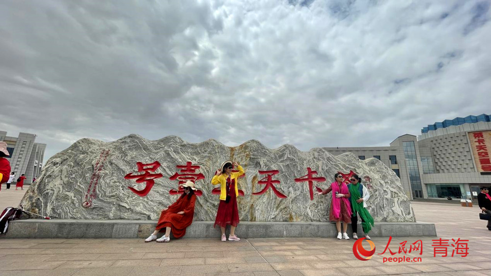 游客在茶卡天空壹號鹽雕前拍照留念。人民網(wǎng) 陳明菊攝