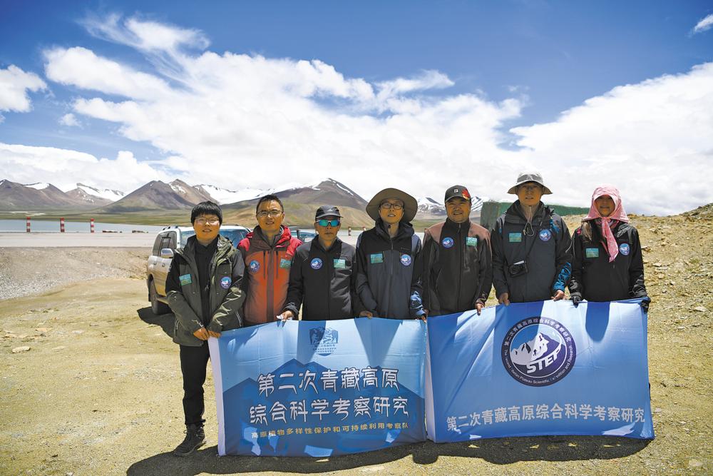 張發(fā)起(左二)帶領(lǐng)科考隊(duì)在可可西里-羌塘高原開(kāi)展二次科考亞洲水塔區(qū)植物多樣性調(diào)查。 圖片由本人提供