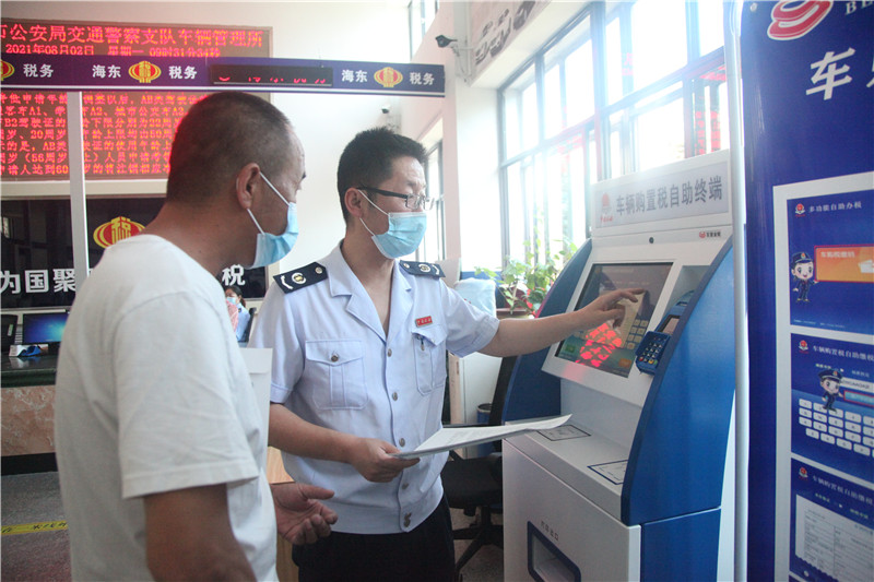 稅務(wù)干部輔導(dǎo)納稅人通過車購稅自主終端機(jī)辦理業(yè)務(wù)。國家稅務(wù)總局海東市稅務(wù)局供圖