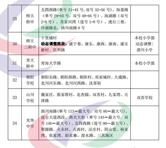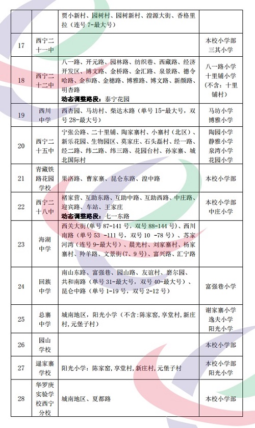 升學(xué)學(xué)生具有西寧城區(qū)戶籍,且法定監(jiān)護(hù)人房產(chǎn)地址信息與戶口信息一致的,可按學(xué)區(qū)劃分范圍分配入學(xué)(具體學(xué)區(qū)范圍見下表)。