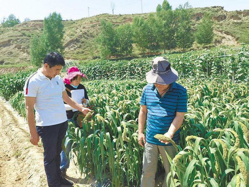 種子站工作人員討論新品種生長(zhǎng)情況。青海日?qǐng)?bào)記者 潘玲 攝