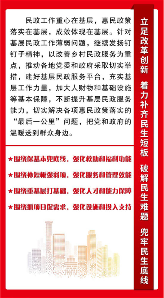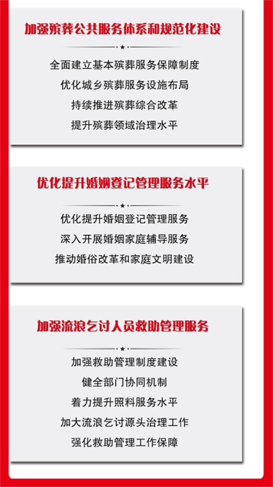 據(jù)了解,《規(guī)劃》以智慧民政、陽(yáng)光民政、服務(wù)民政、幸福民政“四個(gè)民政”為載體,部署了“十四五”時(shí)期民政事業(yè)發(fā)展的主要任務(wù)。并全面總結(jié)民政事業(yè)發(fā)展基礎(chǔ),深入分析民政事業(yè)所處的發(fā)展環(huán)境、面臨的機(jī)遇挑戰(zhàn),描繪了2035年民政事業(yè)發(fā)展的遠(yuǎn)景目標(biāo)。